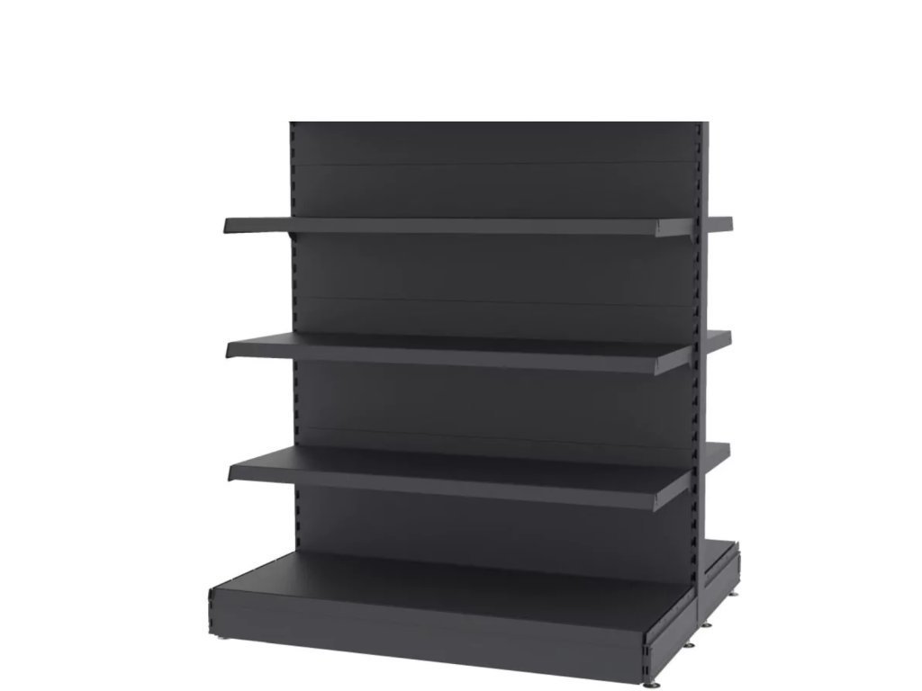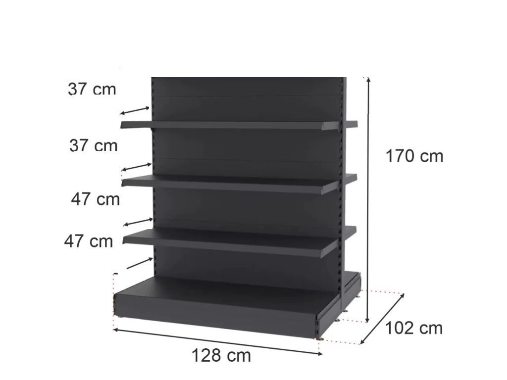 Obchodní regál typu gondola MAGO, základní modul, výšky 170 cm a délky 128 cm, se základnou o hloubce 47 cm a závěsnými policemi o hloubce 47cm a 37 cm, v grafitové barvě. Maximální nosnost jedné police je 120 kg při rovnoměrném rozložení zátěže.