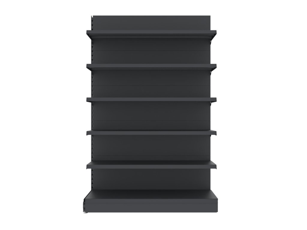 Obchodní regál MAGO přídavný modul o výšce 210 cm a délce 134,5 cm, se základnou o hloubce 47 cm a závěsnými policemi o hloubce 37 cm v grafitové barvě. Maximální nosnost jedné police je 120 kg při rovnoměrně rozloženém zatížení.