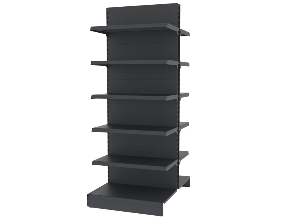 Obchodní regál MAGO přídavný modul o výšce 210 cm a délce 81,5 cm, se základnou o hloubce 47 cm a závěsnými policemi o hloubce 37 cm v grafitové barvě. Maximální nosnost jedné police je 120 kg při rovnoměrně rozloženém zatížení.