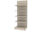 Regály přístěnné jsou standardním vybavením každého typu obchodu. Je možné je upravit libovolným způsobem výběrem vhodných prvků. Díky perforovaným zadním stranám získáte možnost montáže závěsných systémů a háčků na menší produkty. Toto řešení zcela mění způsob používání přístěnného regálu.