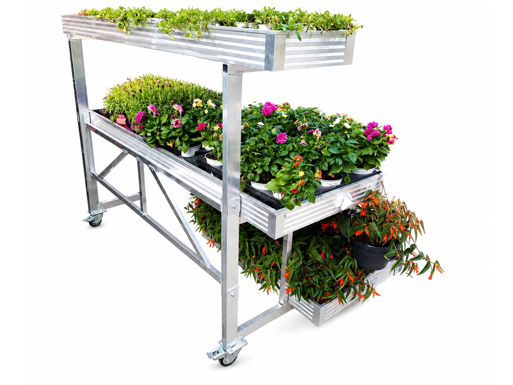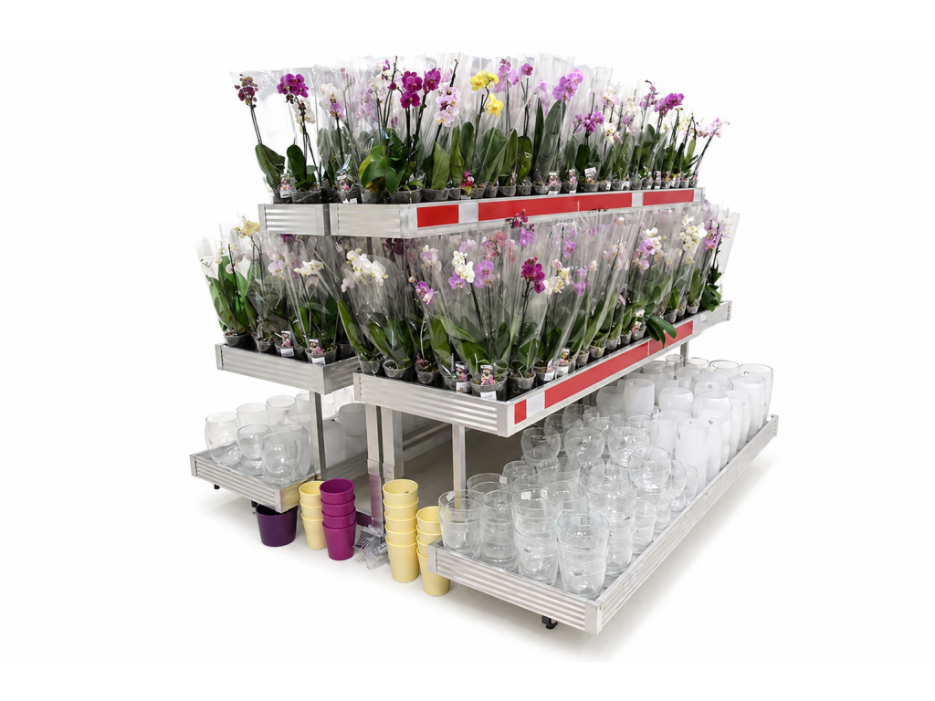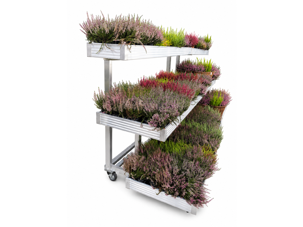Zalévací stoly jsou ideální pro prezentaci rostlin v zahradních centrech. Umístění ve zvýšené poloze přitahuje pozornost zákazníků a zároveň nabízí pohodlný způsob prezentace – zákazník se nemusí k rostlinám ohýbat. Kaskádové provedení navíc ještě více zvyšuje vizuální atraktivitu.