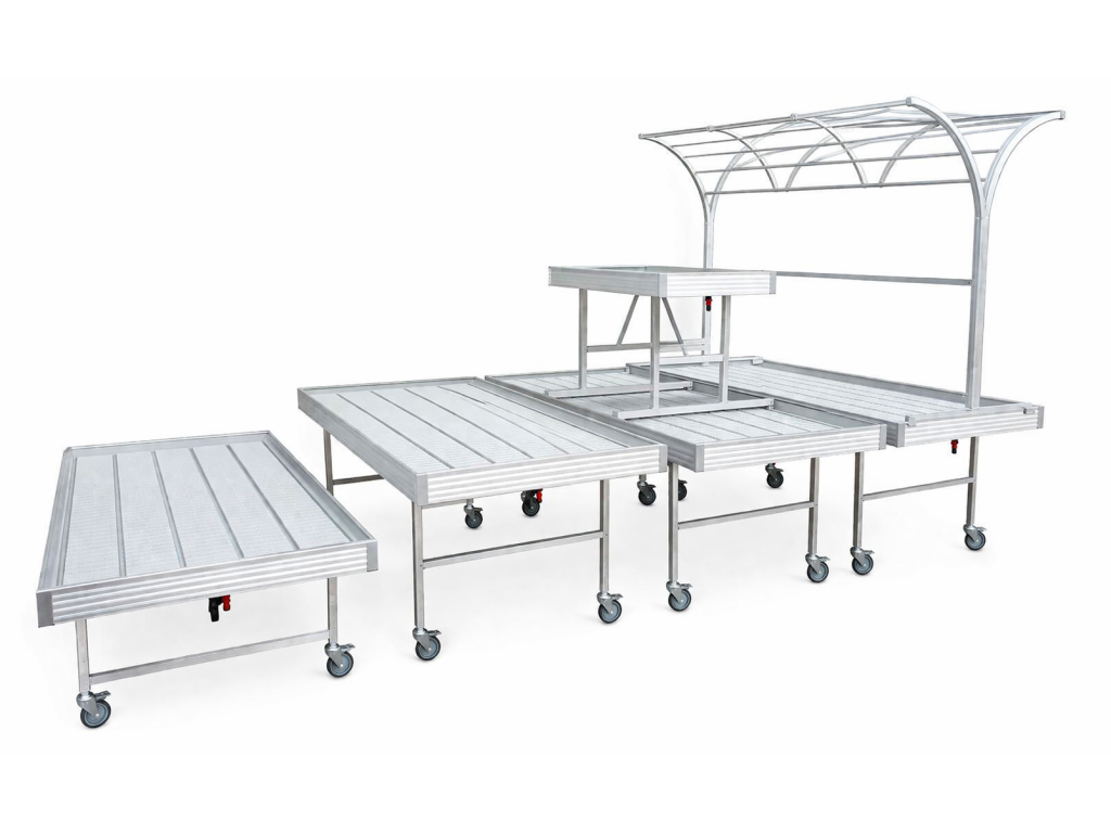 Nové zalévací stoly Rozměr: 2,5 m × 1,2 m Konstrukce: hliníková konstrukce stolu plastová podlaha (výplň) Provedení: mobilní verze na kolečkách...