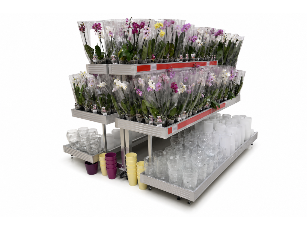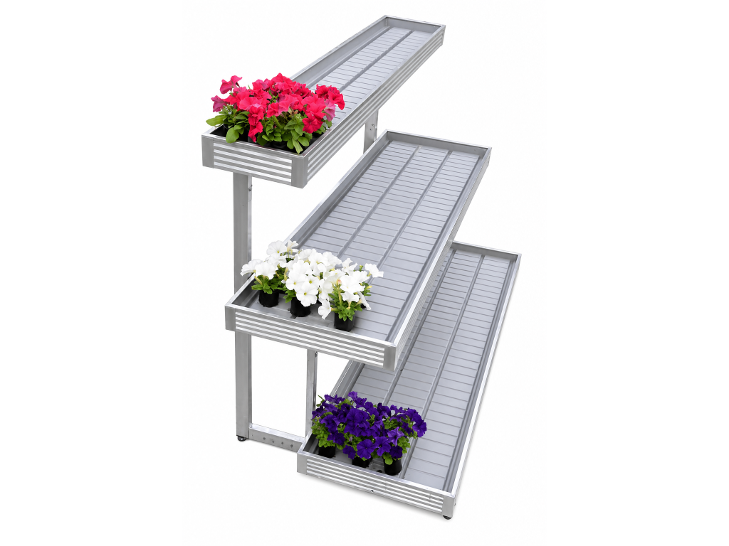 Zalévací stoly jsou ideální pro prezentaci rostlin v zahradních centrech. Umístění ve zvýšené poloze přitahuje pozornost zákazníků a zároveň nabízí pohodlný způsob prezentace – zákazník se nemusí k rostlinám ohýbat. Kaskádové provedení je navíc velmi atraktivní a dobře viditelné.
