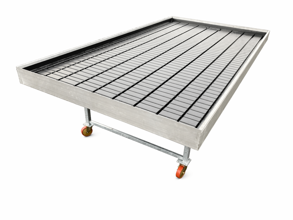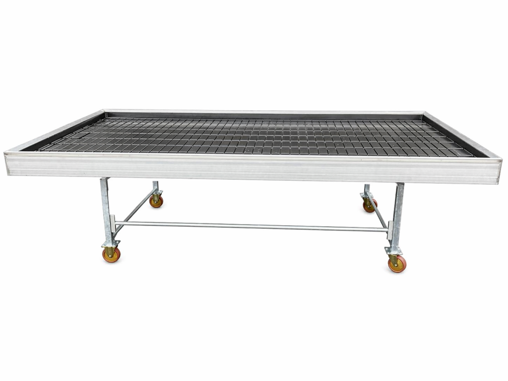 Nový zalévací stůl s hliníkovým rámem, plastovou podlahou a nohami v mobilním provedení (na kolečkách)Rozměry: 3 m × 1,6 m