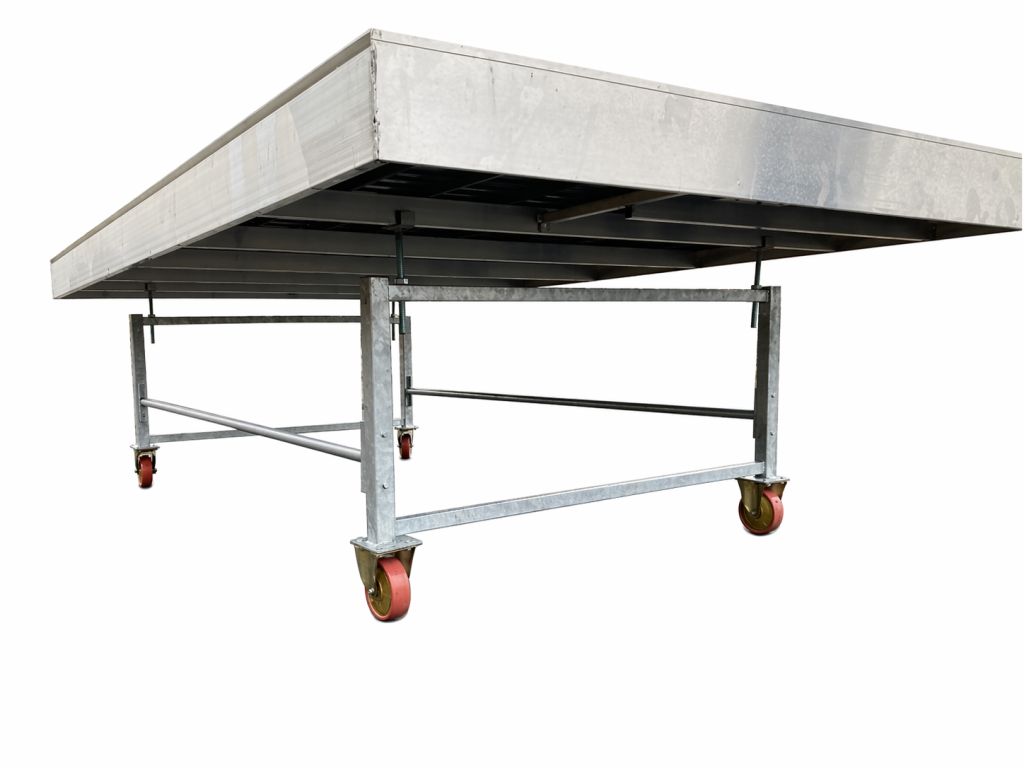 Nové zalévací stoly Rozměr: 2,5 m × 1,2 m Konstrukce: hliníková konstrukce stolu plastová podlaha (výplň) Provedení: mobilní verze na kolečkách...