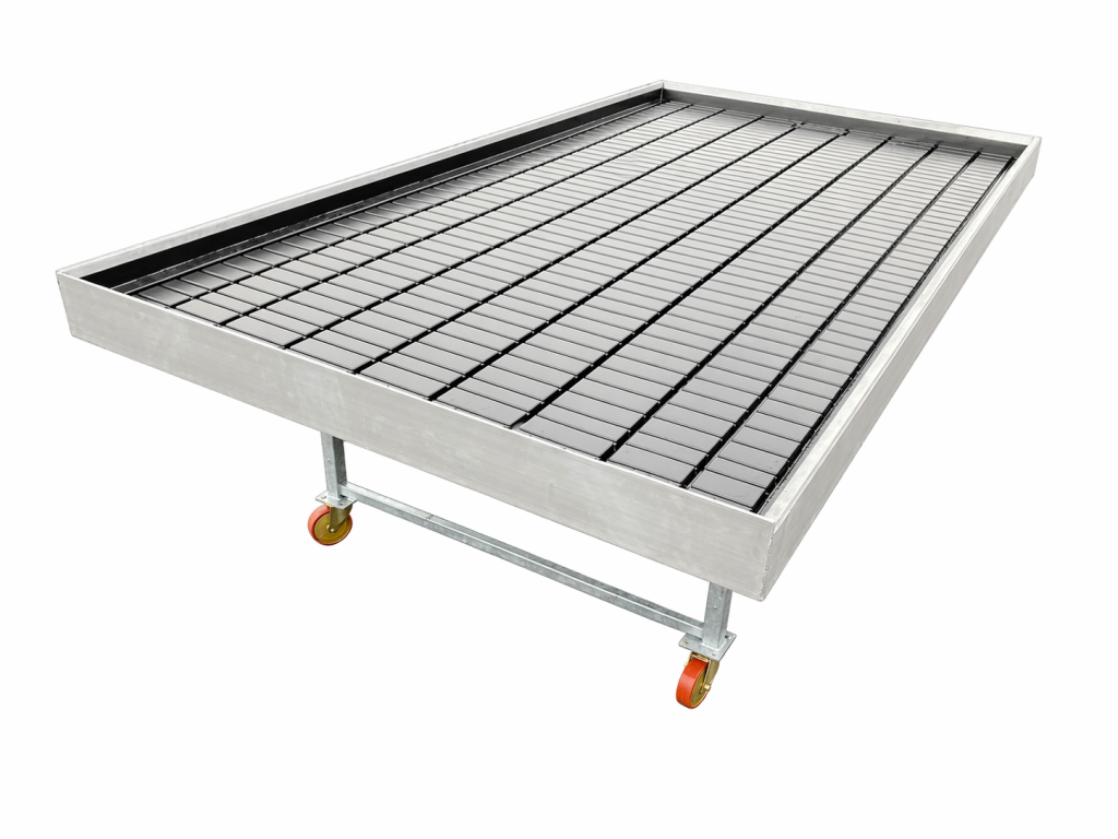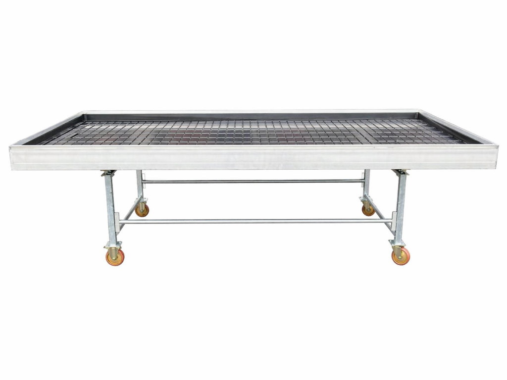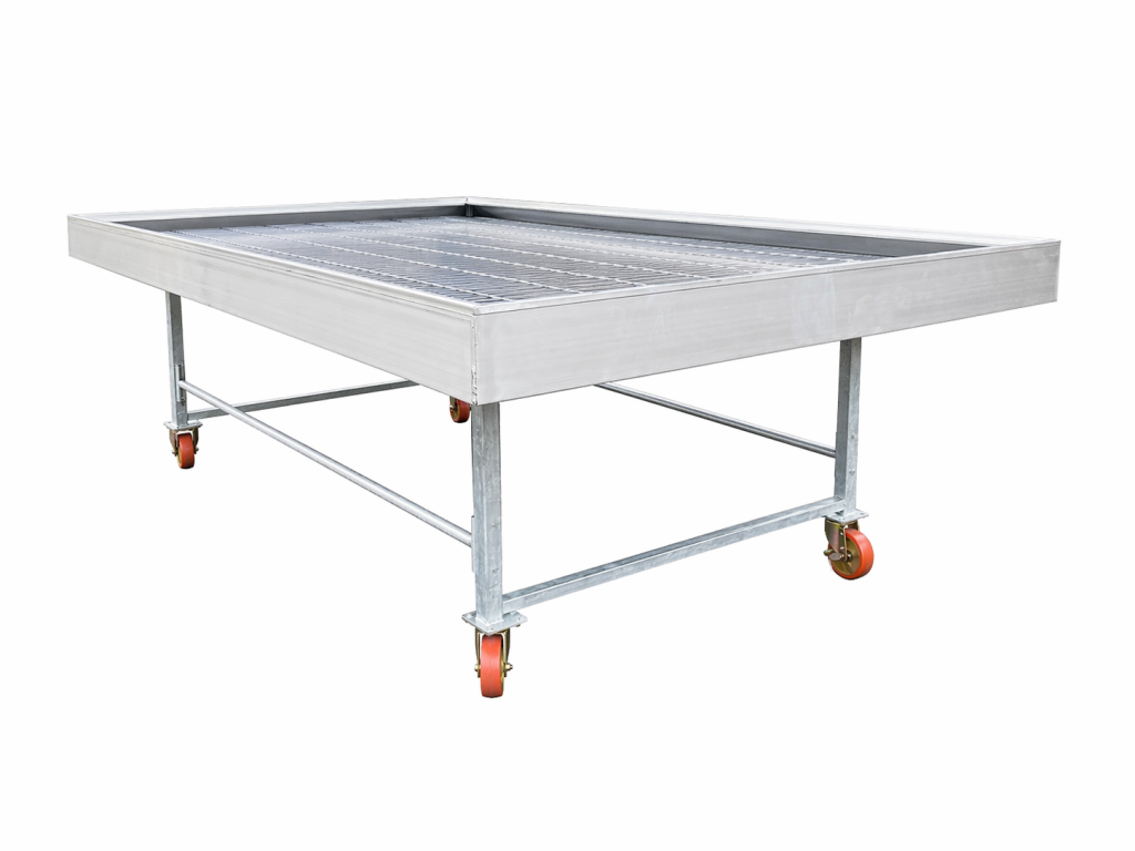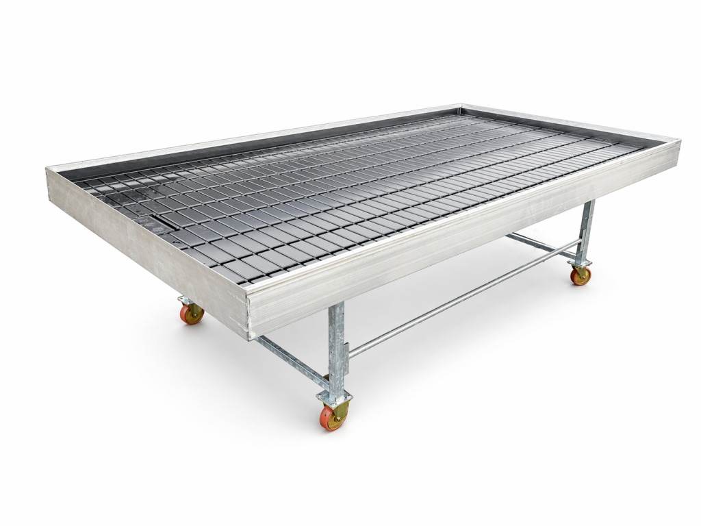 Nové zalévací stoly Rozměr: 200 × 100 cm Konstrukce: hliníková konstrukce stolu plastová podlaha (výplň) Provedení: mobilní verze na kolečkách ...
