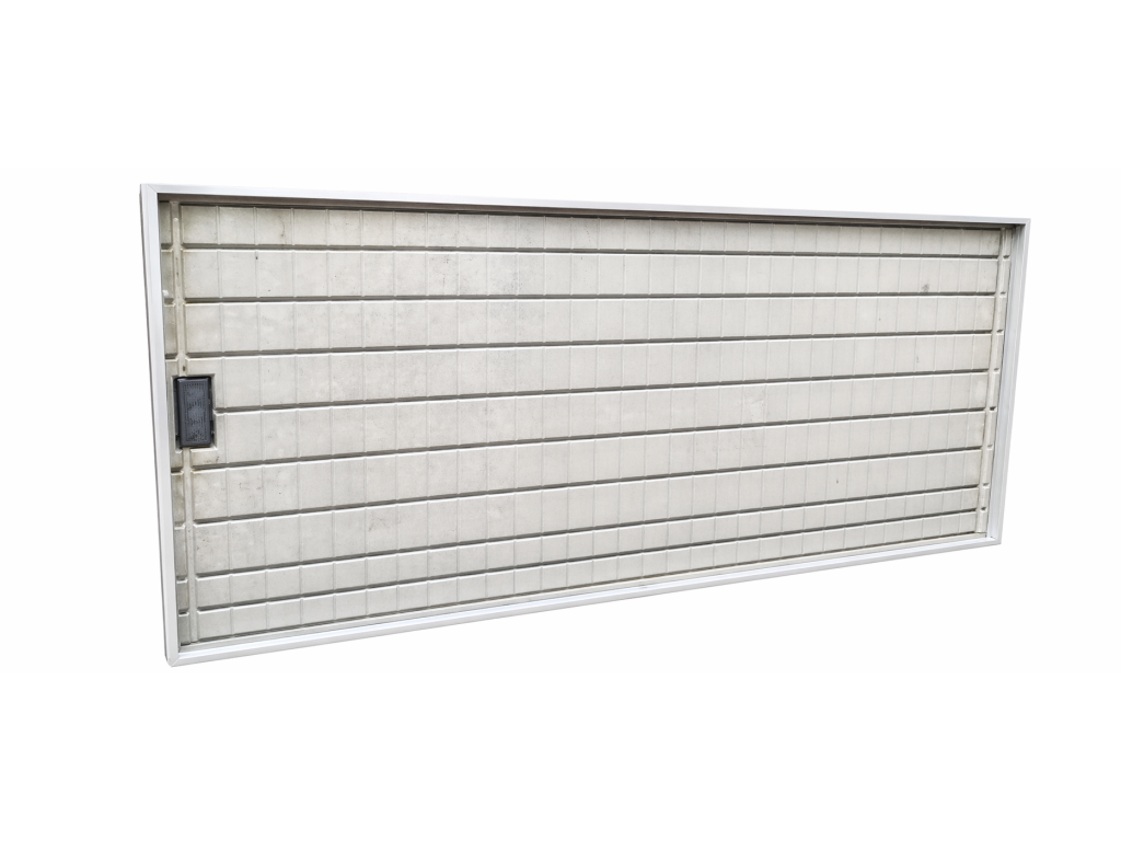 Zalévací stůl s použitým hliníkovým rámem a novou plastovou plochou Rozměry: 3,96 m × 1,57 m