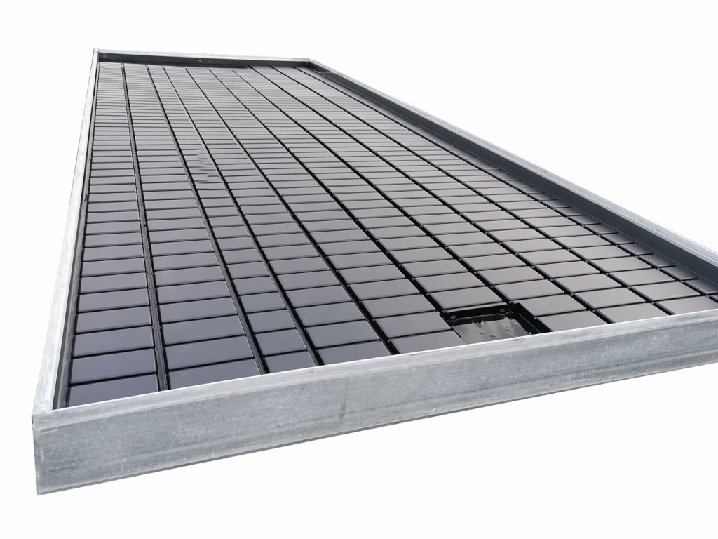 Zalévací stůl s použitým hliníkovým rámem a novou plastovou plochou Rozměry: 3,96 m × 1,57 m