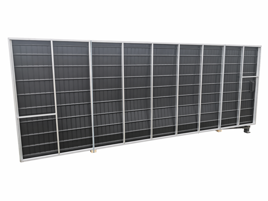 Zalévací stůl s použitým hliníkovým rámem a novou plastovou plochou Rozměry: 3,96 m × 1,57 m