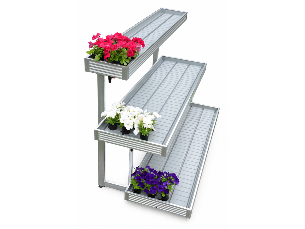 Zalévací stoly jsou ideální pro prezentaci rostlin v zahradních centrech. Umístění ve zvýšené poloze přitahuje pozornost zákazníků a zároveň nabízí pohodlný způsob prezentace – zákazník se nemusí k rostlinám ohýbat. Kaskádové provedení je navíc velmi atraktivní a dobře viditelné.