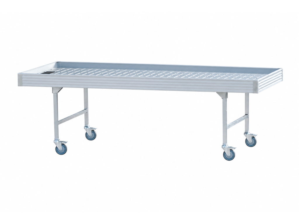 Zalévací stůl s použitým hliníkovým rámem a novou plastovou plochou Rozměry: 3 m × 1,6 m Provedení: s mobilními nohami (na kolečkách)