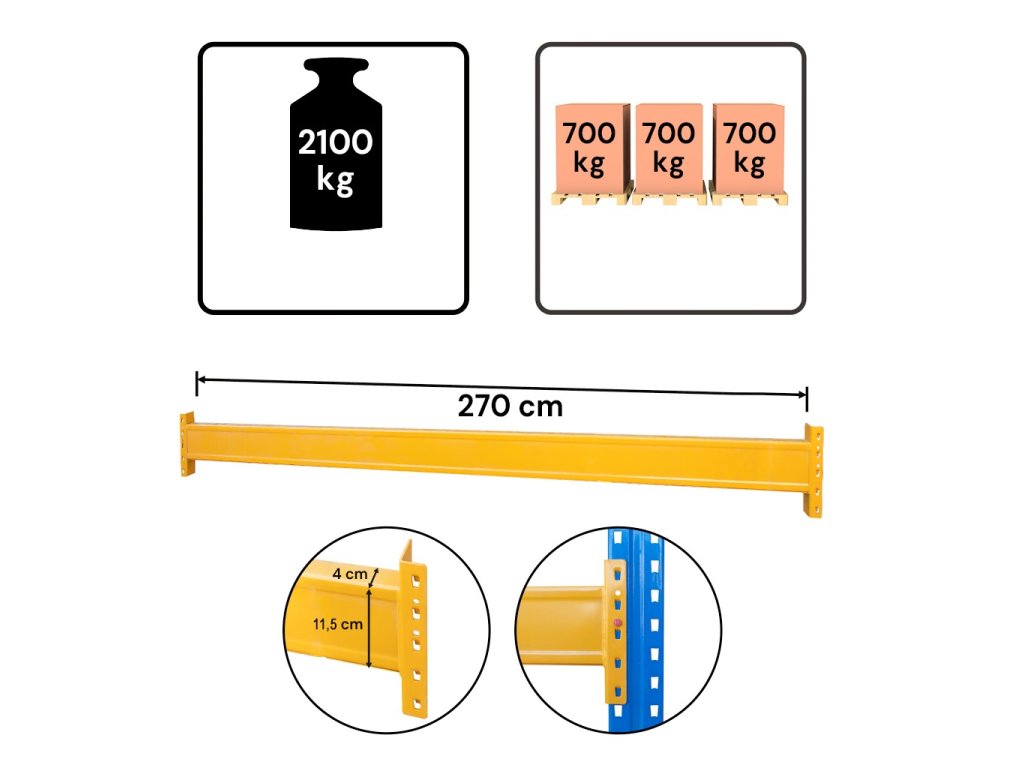Nosník JUNGHEINRICH MPB (TBS) o délce 270 cm a profilu 11,5×4 cm je základním konstrukčním prvkem paletového regálu, který plní funkci nosné vodorovné traverzy. Umožňuje vytvářet stabilní úrovně pro skladování i kompletaci zboží.Nosník se vyznačuje vysokou nosností – 2100 kg na pár, což odpovídá 700 kg na jedno paletové místo, a umožňuje tak bezpečné uložení tří europalet (120×80 cm).Je vyroben z odolné oceli práškově lakované ve žluté barvě, což zajišťuje ochranu proti mechanickému poškození a korozi.