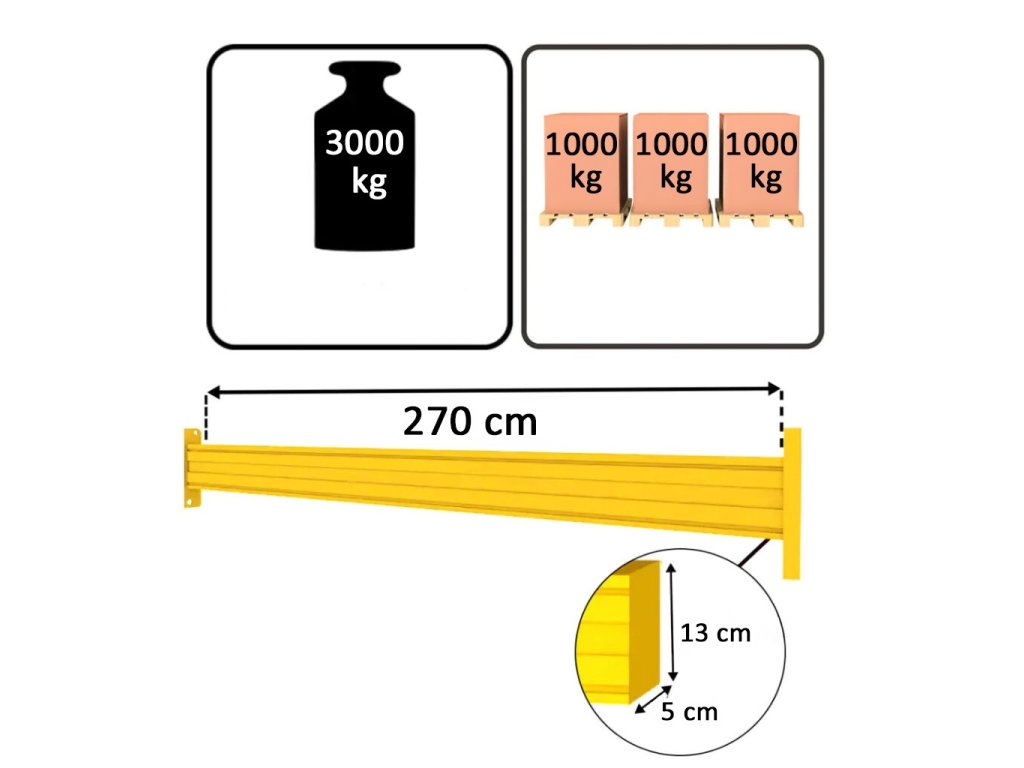 Nosník JUNGHEINRICH MPB (TBS) o délce 270 cm a profilu 13×5 cm je základním konstrukčním prvkem paletového regálu, který plní funkci nosné vodorovné traverzy. Umožňuje vytvářet stabilní úrovně pro skladování i kompletaci zboží.Nosník se vyznačuje vysokou nosností – 3000 kg na pár, což odpovídá cca 1000 kg na jedno paletové místo, a umožňuje tak bezpečné uložení tří europalet (120×80 cm).Je vyroben z odolné oceli práškově lakované ve žluté barvě, což zajišťuje ochranu proti mechanickému poškození a korozi.