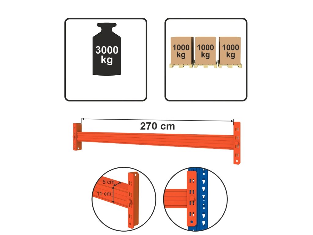 Nosník MECALUX, délka 270 cm, profil 11×5 cm, nosnost na úroveň 3000 kg, oranžový