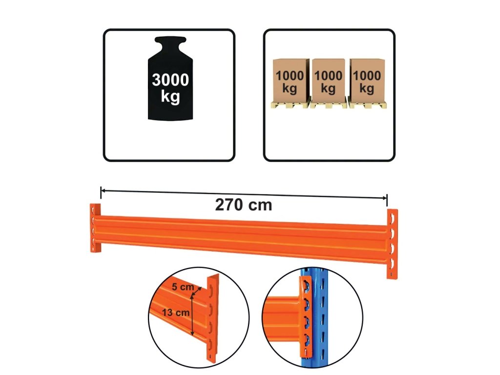 Nosník značky STOW o délce 270 cm v oranžové barvě je konstrukčním prvkem skladových regálů, který přenáší zatížení.