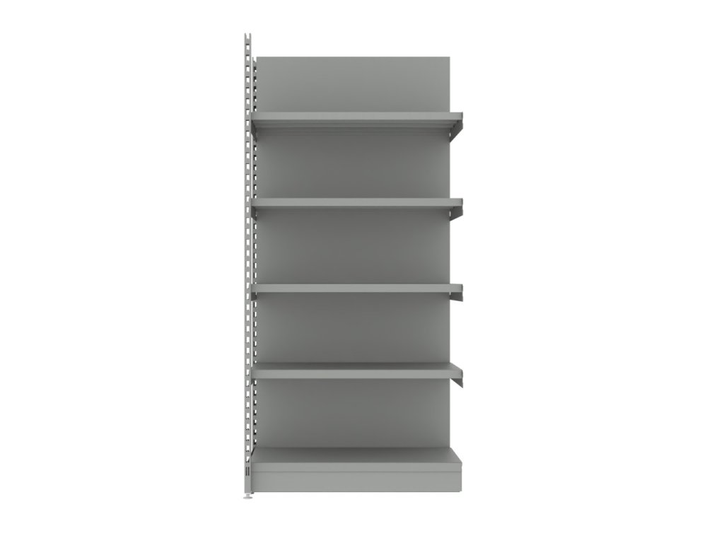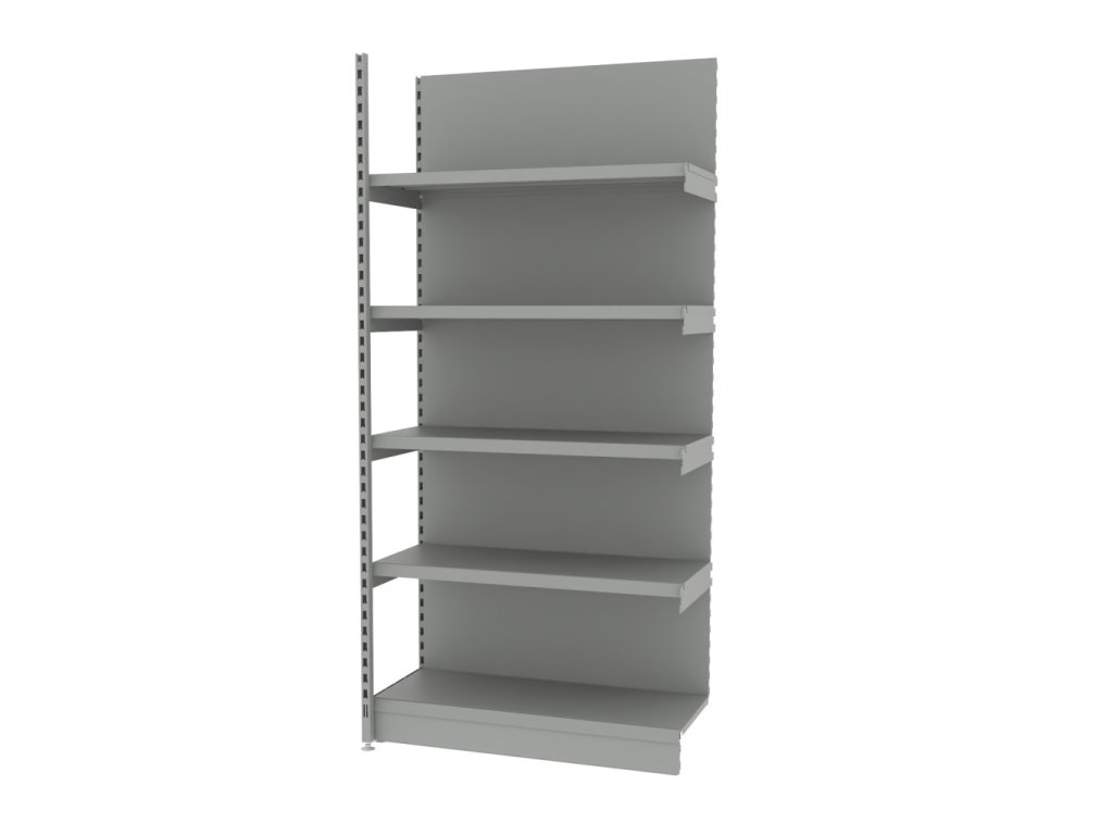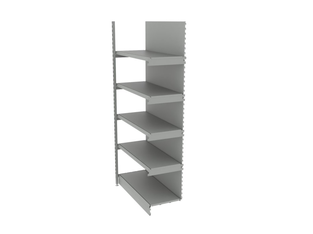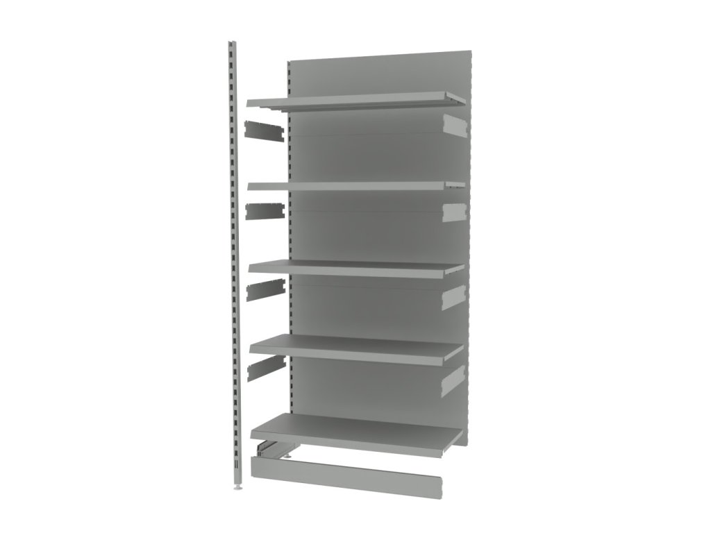 Zesílený nástěnný obchodní regál značky MAGO – přídavný modul o výšce 210 cm a délce 101,5 cm, se spodní policí o hloubce 47 cm a závěsnými policemi rovněž o hloubce 47 cm, v barvě světle šedé. Díky použití dodatečného vyztužení v podobě ocelových profilů v přední části regálu činí maximální nosnost police 255 kg při rovnoměrně rozloženém zatížení.