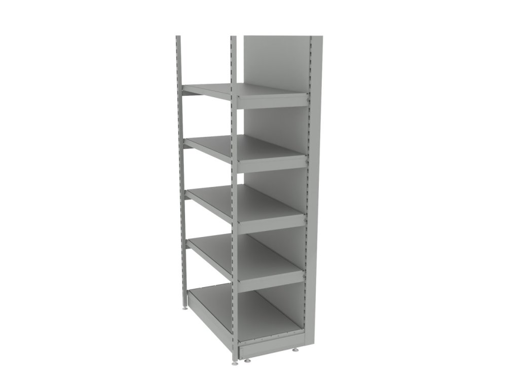 Zesílený nástěnný obchodní regál značky MAGO – základní modul o výšce 210 cm a délce 103 cm, se spodní policí o hloubce 57 cm a závěsnými policemi rovněž o hloubce 57 cm, v barvě světle šedé. Díky použití dodatečného vyztužení v podobě ocelových profilů v přední části regálu činí maximální nosnost police 340 kg při rovnoměrně rozloženém zatížení.