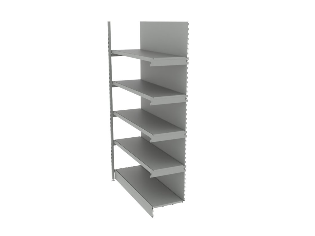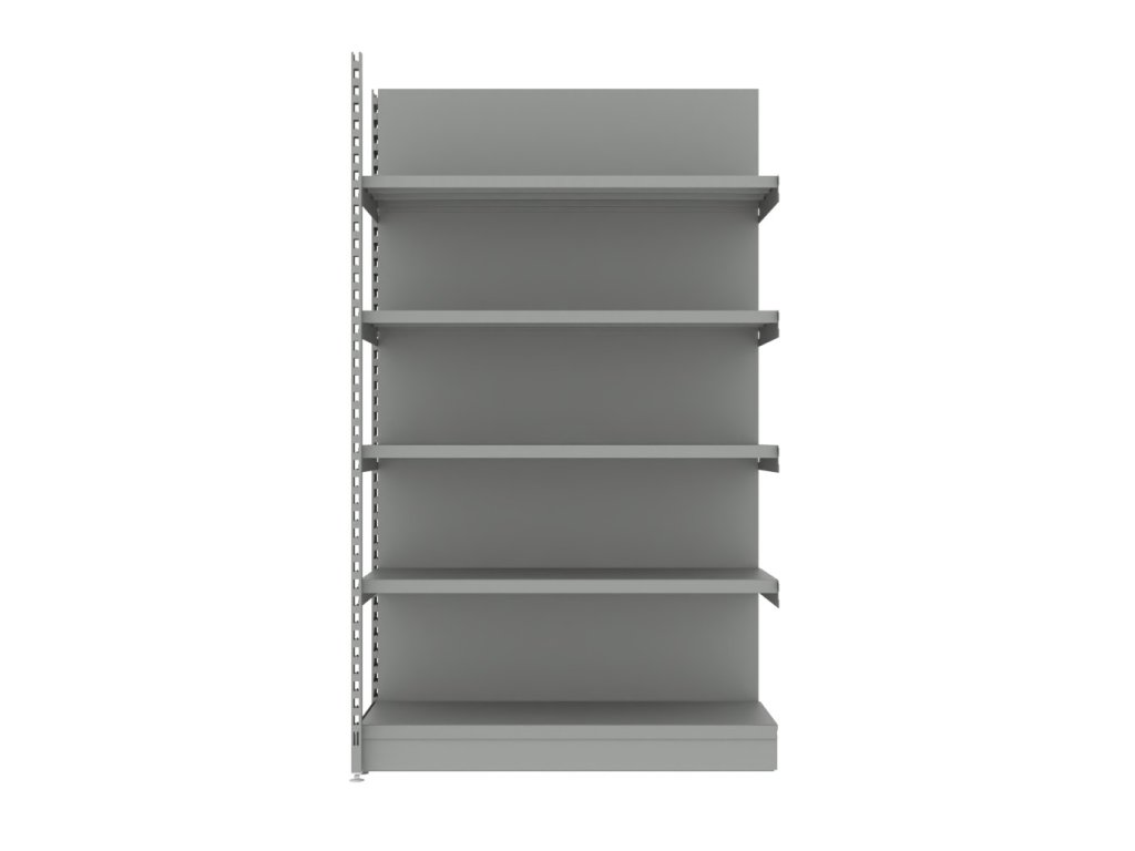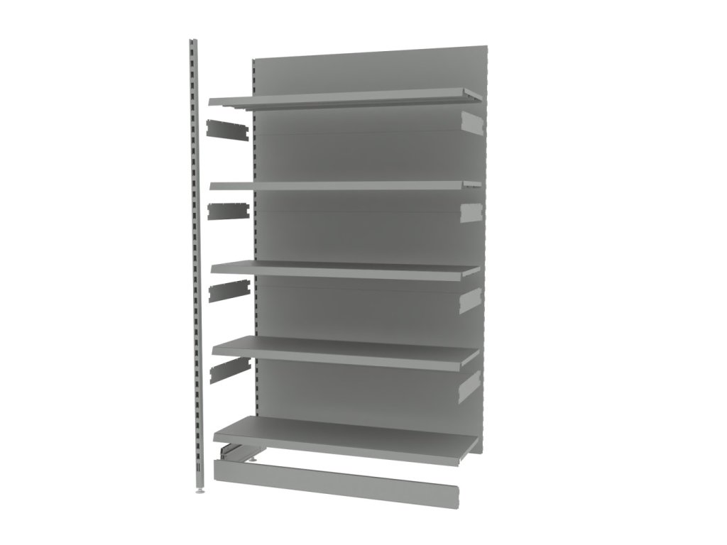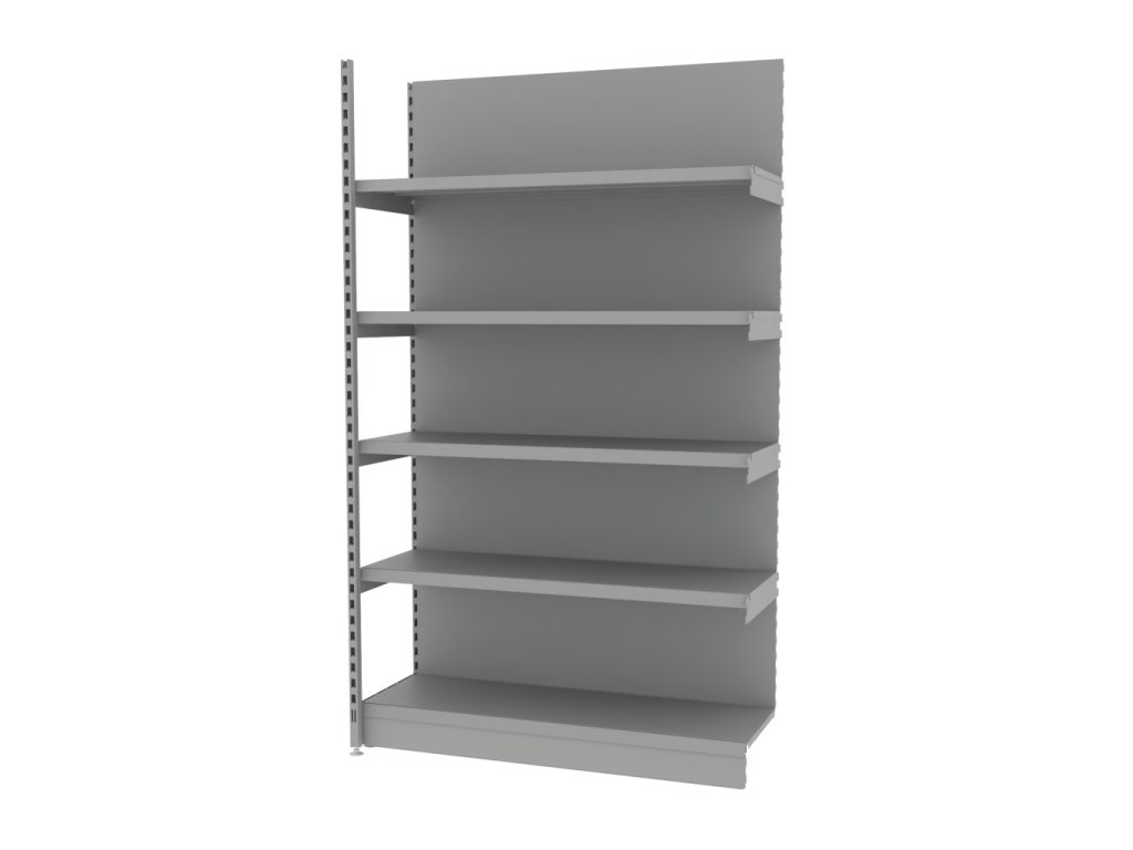 Zesílený nástěnný obchodní regál značky MAGO – přídavný modul o výšce 210 cm a délce 126,5 cm, se spodní policí o hloubce 47 cm a závěsnými policemi rovněž o hloubce 47 cm, v barvě světle šedé. Díky použití dodatečného vyztužení v podobě ocelových profilů v přední části regálu činí maximální nosnost police 255 kg při rovnoměrně rozloženém zatížení.