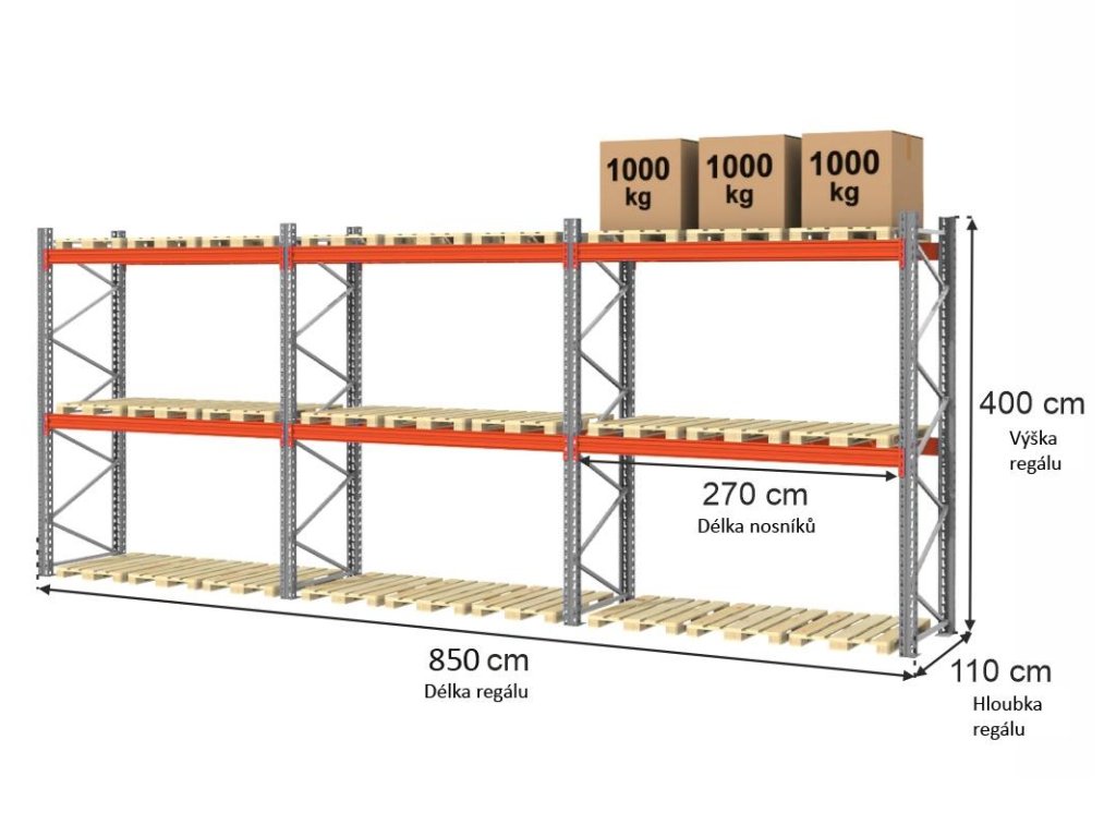 Paletový skladový regál značky BEG o výšce 400 cm a délce 850 cm, s 0+2 úrovněmi, maximální zatížení na úroveň 3100 kg, což představuje 1033 kg na jedno paletové místo. Regál má 18 paletových míst. Je ideální pro každý sklad, zejména tam, kde jsou skladovány paletované nebo velkorozměrné zboží.