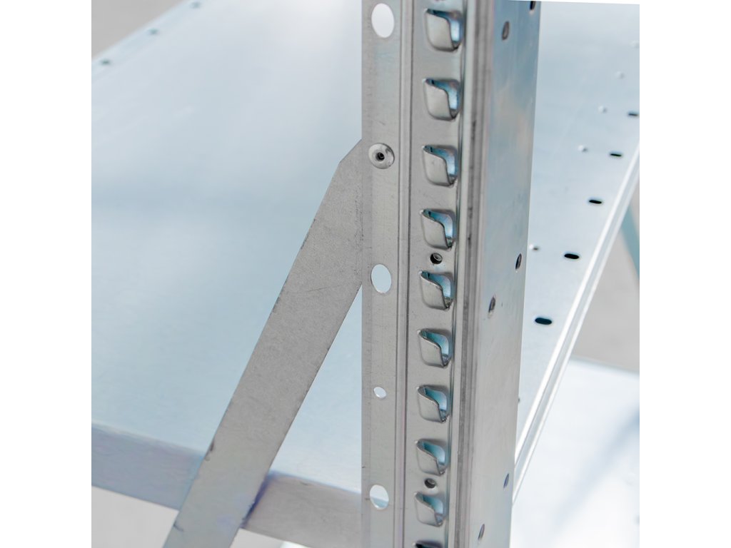 Skladový regál DEXION umožňuje skladování velkého množství zboží. Je vyroben z odolného ocelového plechu opatřeného pozinkovanou povrchovou úpravou. Boční stěny regálu jsou osazeny pozinkovanou kovovou síťovou výplní, která zpevňuje konstrukci regálu a zároveň zabraňuje vypadávání uloženého zboží. Regál je vybaven 5 policovými úrovněmi s nosností 100 kg na každou polici.