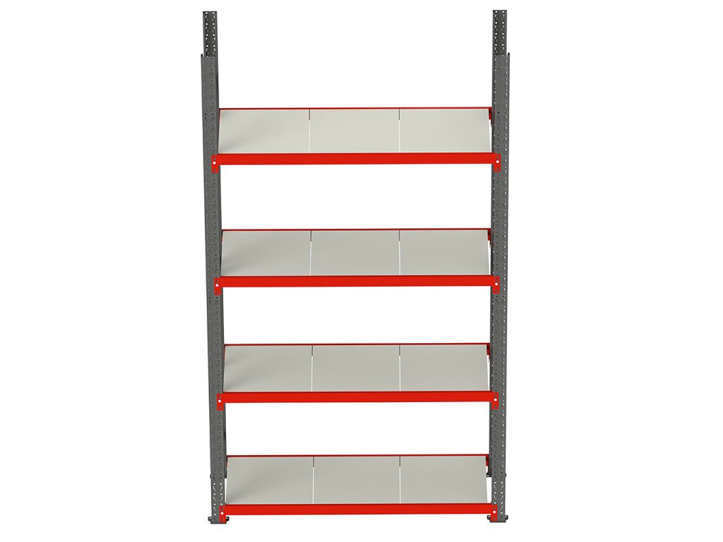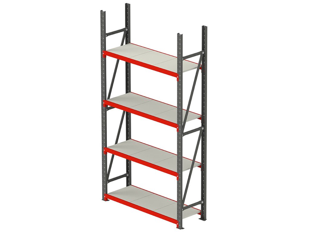 Standardní verze regálu obsahuje 4 police. Lze jej snadno rozšířit díky možnosti dokoupit další police. Každá police se skládá ze 2 nosníků a kovových výplní.