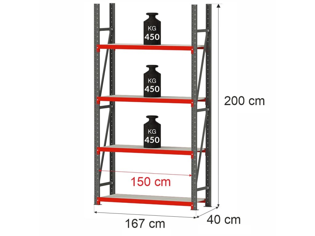 Skladový regál značky FORTIS s výškou 200 cm, délkou 167 cm, hloubkou 40 cm a rozměry polic 150×40 cm.