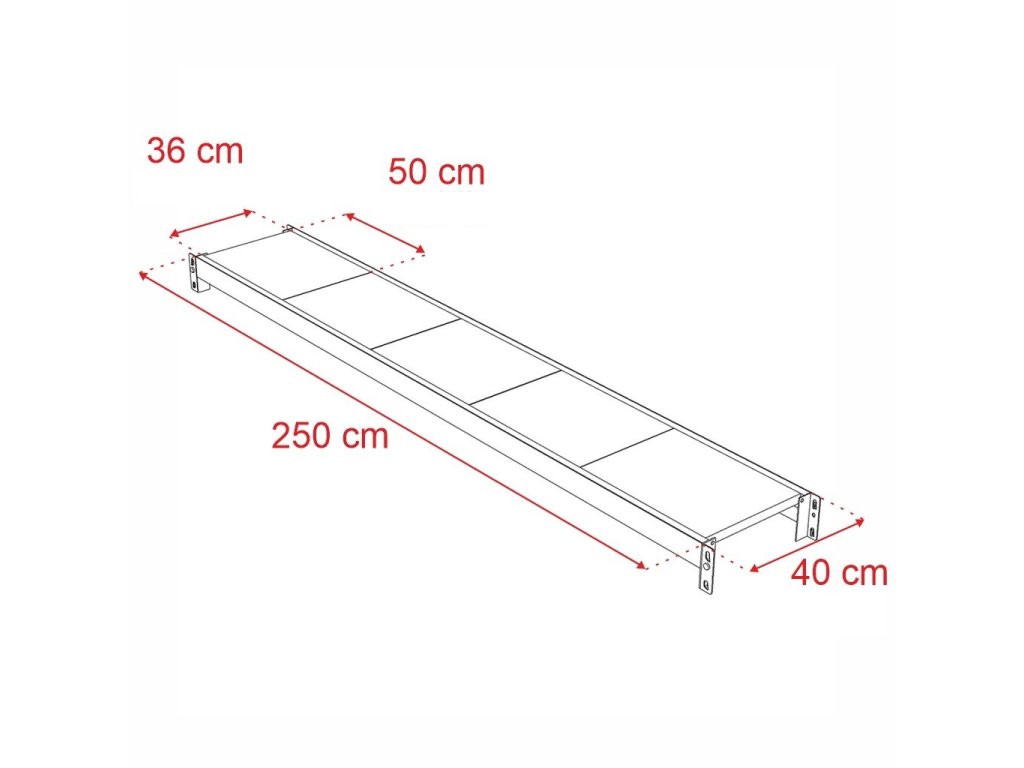 Standardní verze regálu obsahuje 4 police. Lze jej snadno rozšířit díky možnosti dokoupit další police. Každá police se skládá ze 2 nosníků a kovových výplní.