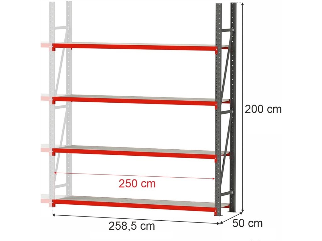 Skladový regál značky FORTIS s výškou 200 cm, délkou 258,5 cm, hloubkou 50 cm a rozměry polic 250×50 cm.