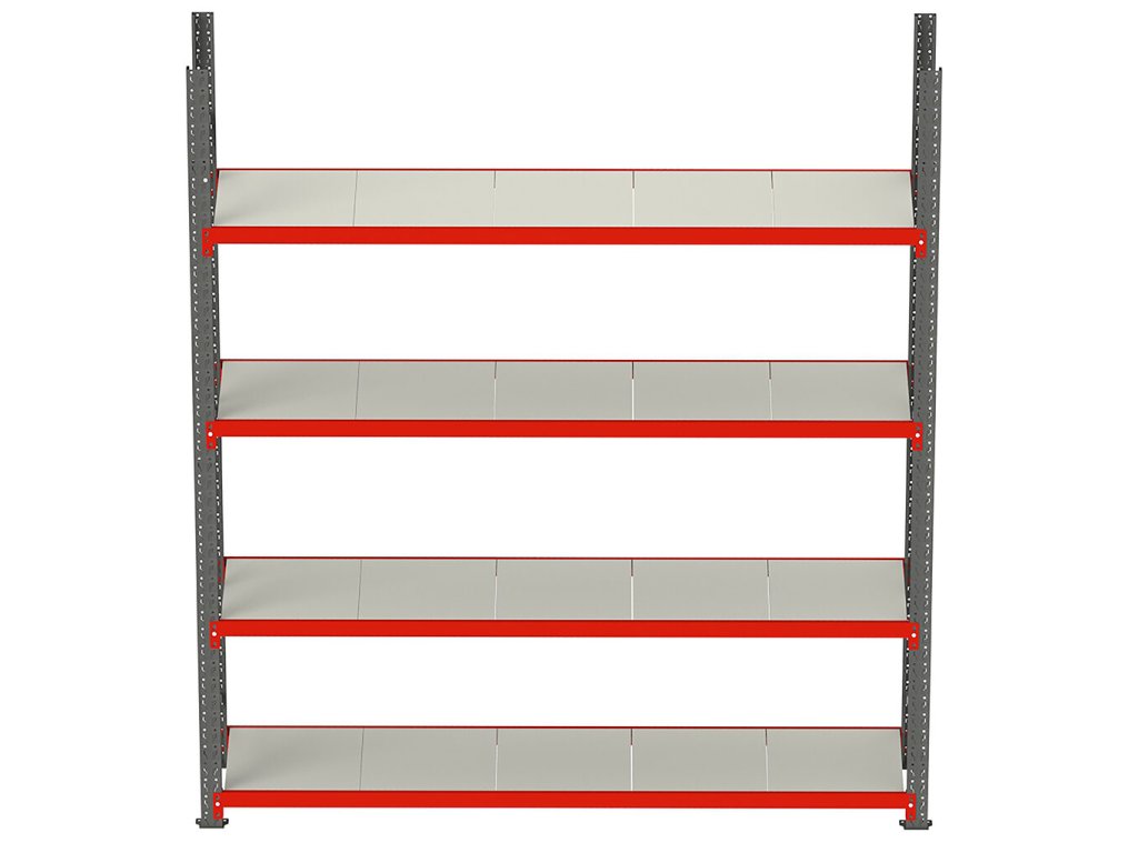 Standardní verze regálu obsahuje 4 police. Lze jej snadno rozšířit díky možnosti dokoupit další police. Každá police se skládá ze 2 nosníků a kovových výplní.