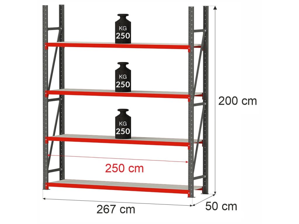 Skladový regál značky FORTIS s výškou 200 cm, délkou 267 cm, hloubkou 50 cm a rozměry polic 250×50 cm.