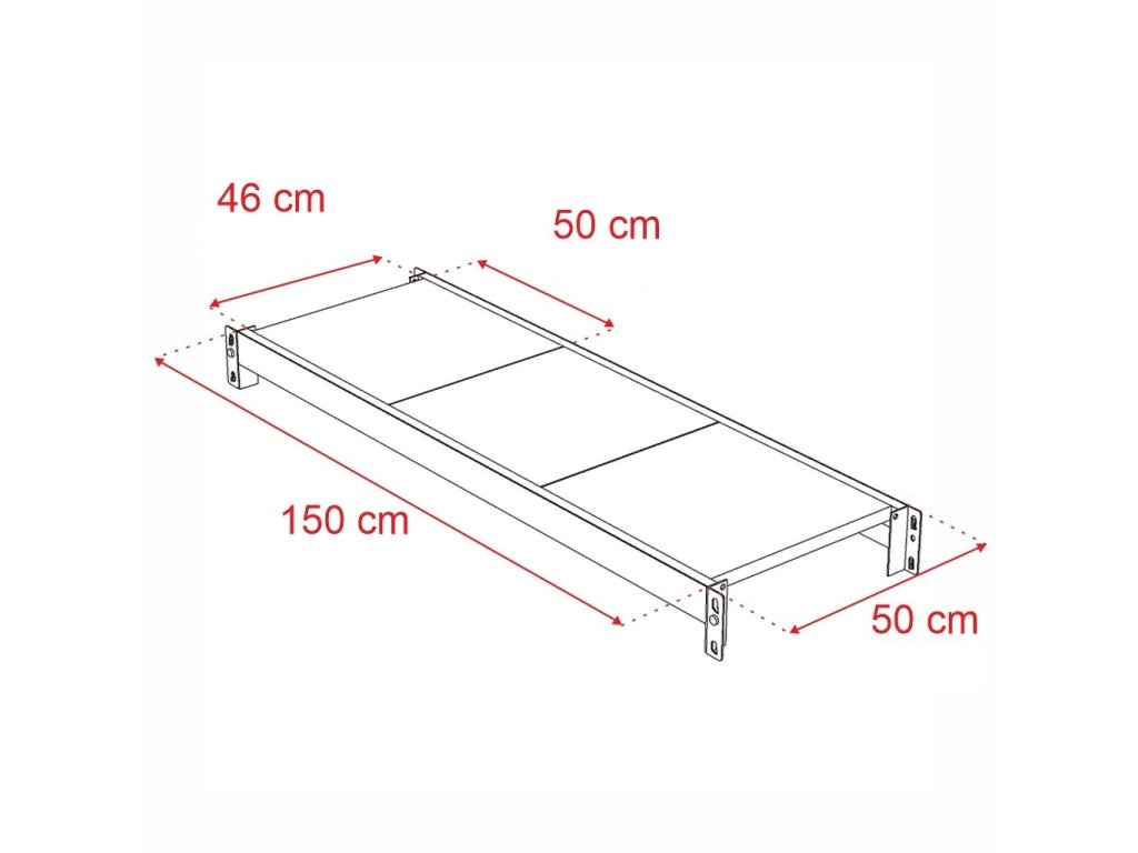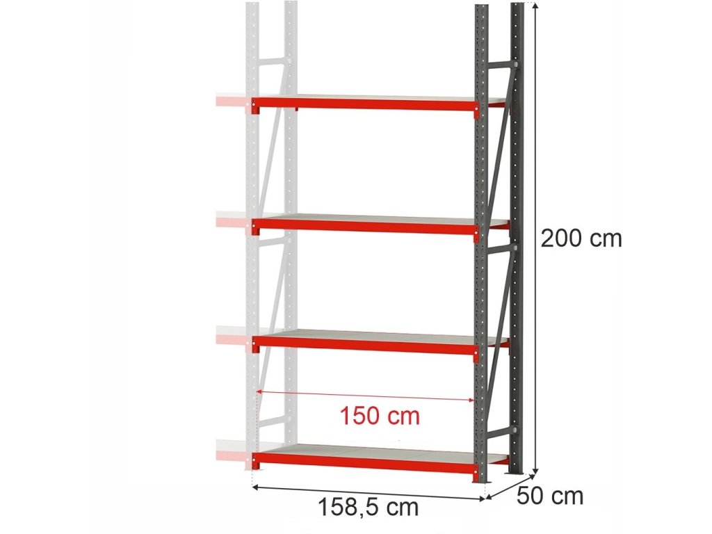 Standardní verze regálu obsahuje 4 police. Lze jej snadno rozšířit díky možnosti dokoupit další police. Každá police se skládá ze 2 nosníků a kovových výplní.