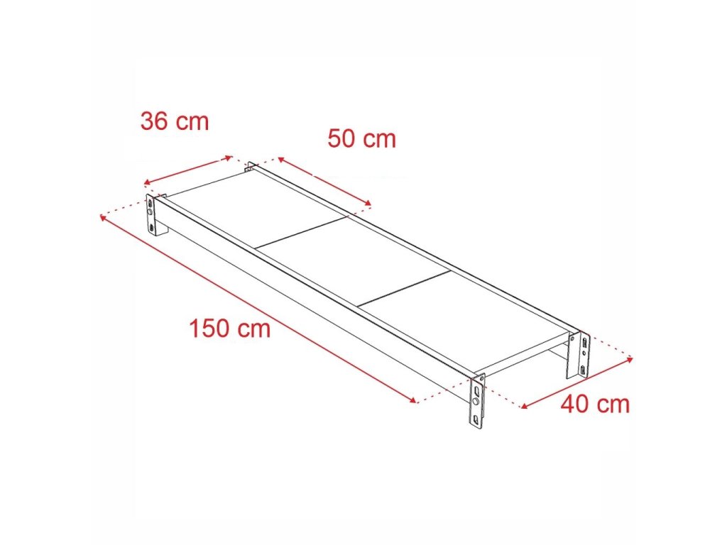 Standardní verze regálu obsahuje 4 police. Lze jej snadno rozšířit díky možnosti dokoupit další police. Každá police se skládá ze 2 nosníků a kovových výplní.