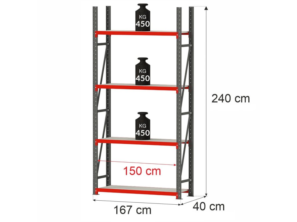 Skladový regál značky FORTIS s výškou 240 cm, délkou 167 cm, hloubkou 40 cm a rozměry polic 150×40 cm.