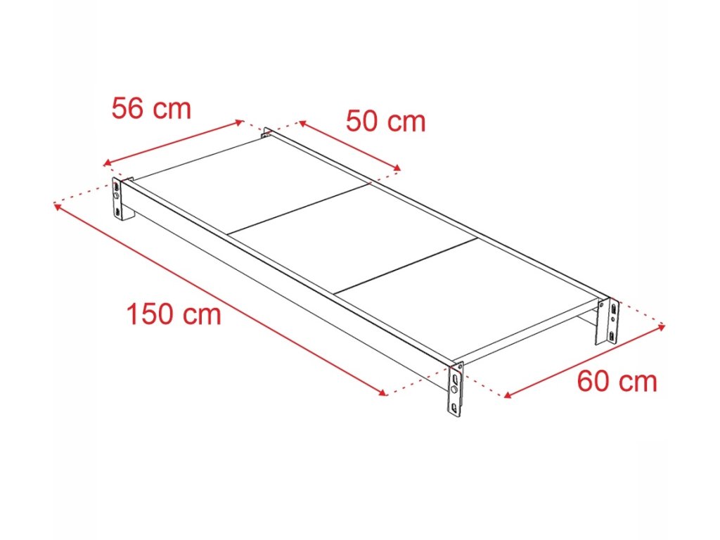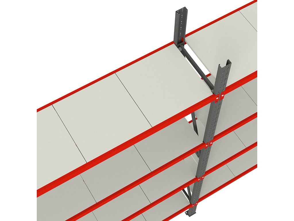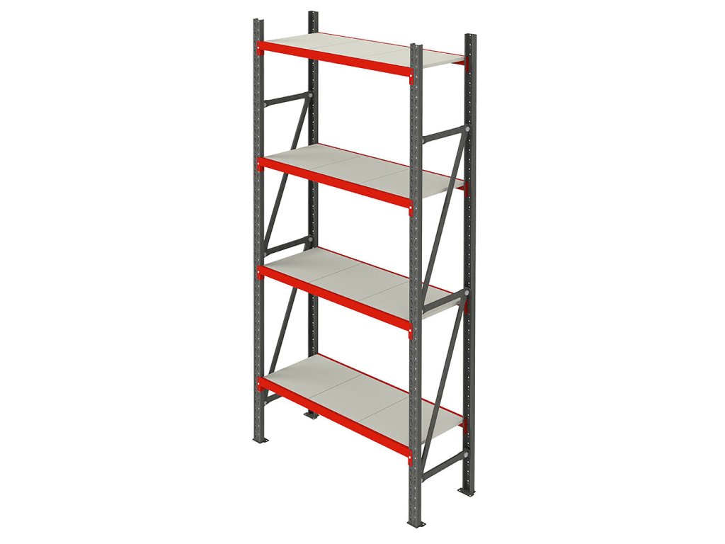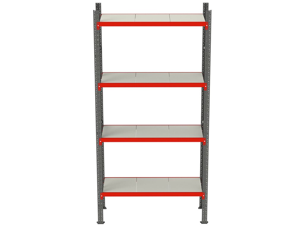 Standardní verze regálu obsahuje 4 police. Lze jej snadno rozšířit díky možnosti dokoupit další police. Každá police se skládá ze 2 nosníků a kovových výplní.