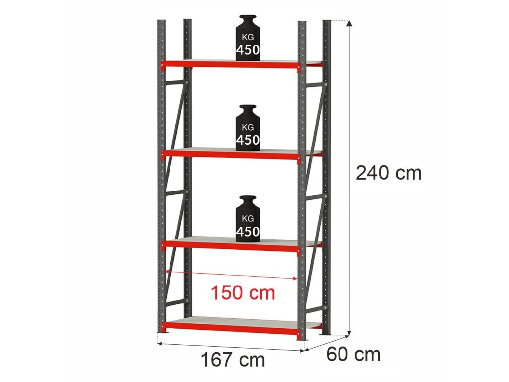 Maximální zatížení na polici je 450 kg při rovnoměrně rozloženém zatížení.