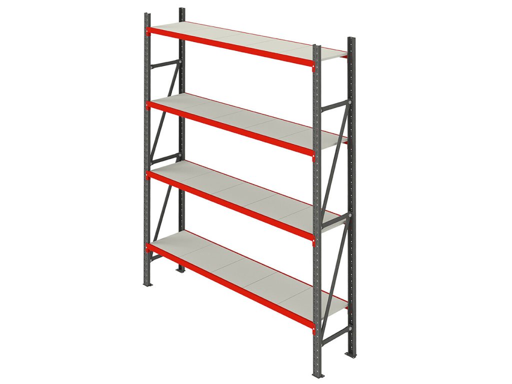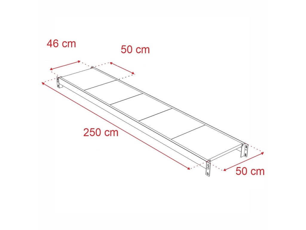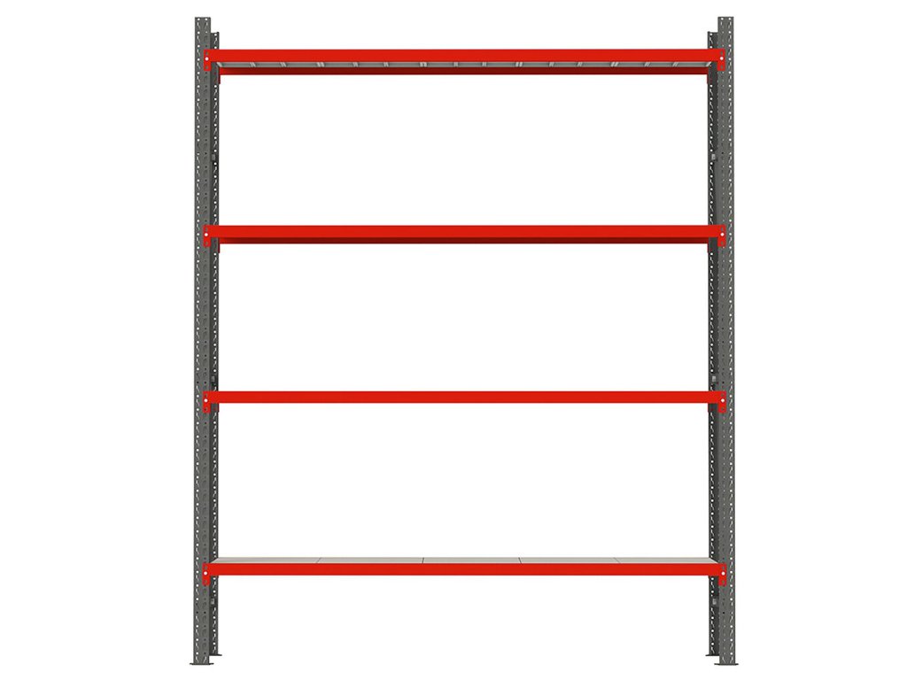 Standardní verze regálu obsahuje 4 police. Lze jej snadno rozšířit díky možnosti dokoupit další police. Každá police se skládá ze 2 nosníků a kovových výplní.