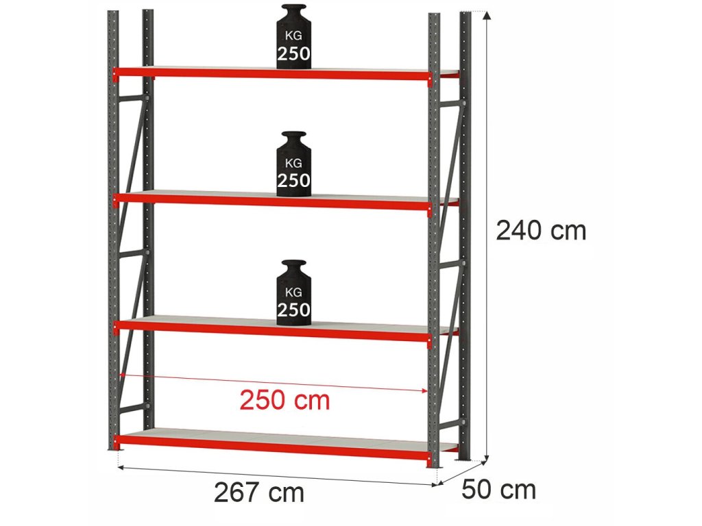 Skladový regál značky FORTIS s výškou 240 cm, délkou 267 cm, hloubkou 50 cm a rozměry polic 250×50 cm.