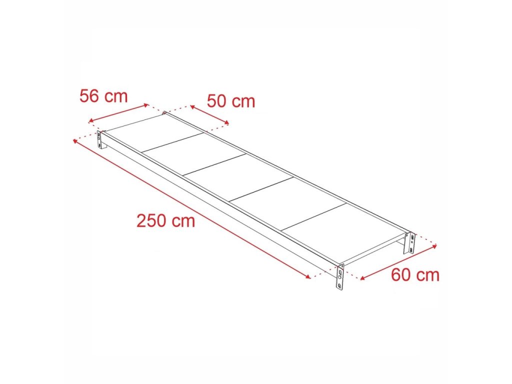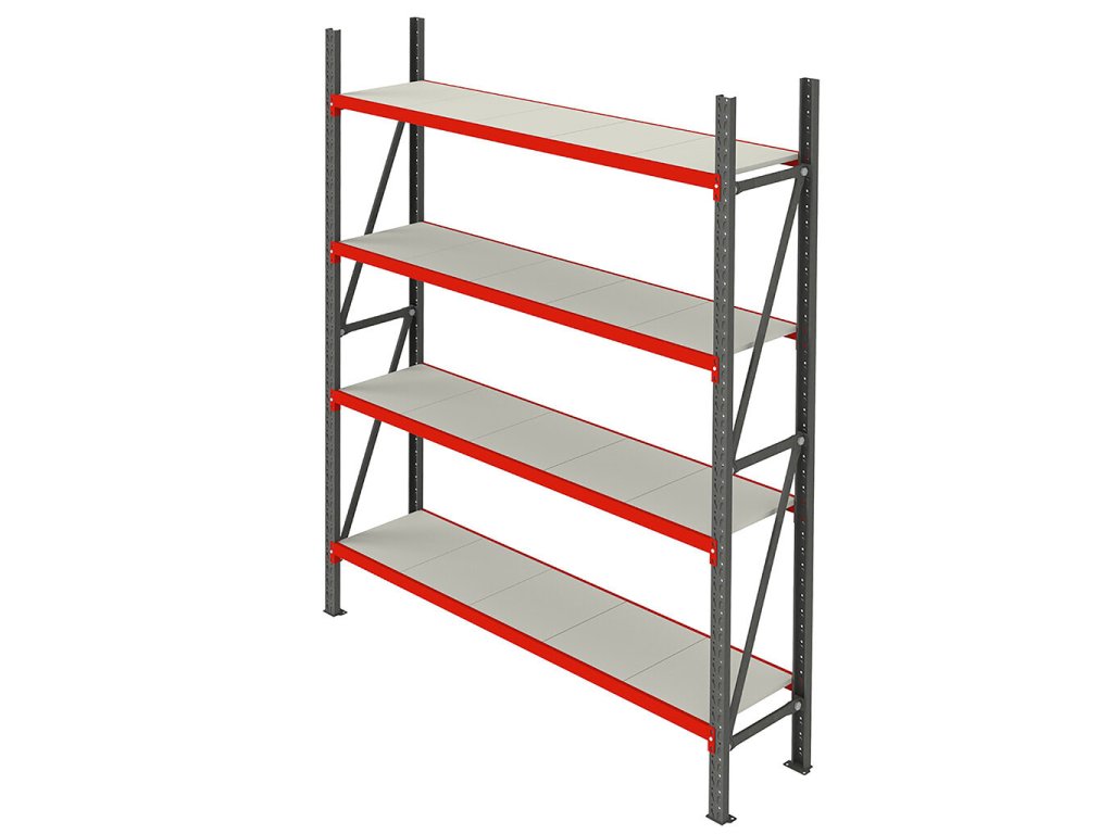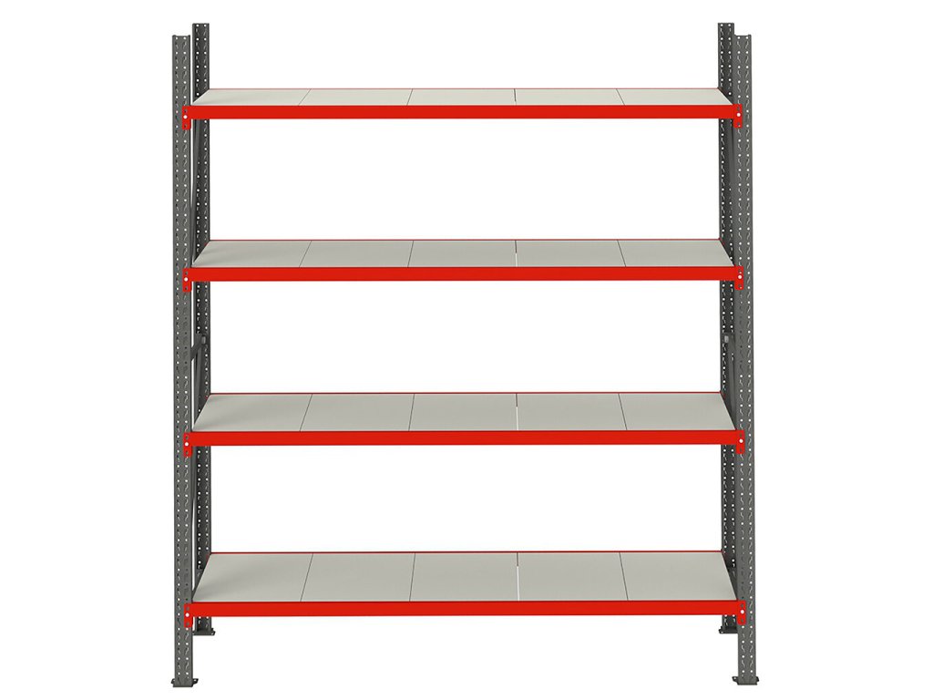 Standardní verze regálu obsahuje 4 police. Lze jej snadno rozšířit díky možnosti dokoupit další police. Každá police se skládá ze 2 nosníků a kovových výplní.