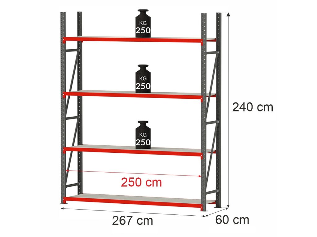 Skladový regál značky FORTIS s výškou 240 cm, délkou 267 cm, hloubkou 60 cm a rozměry polic 250×60 cm.