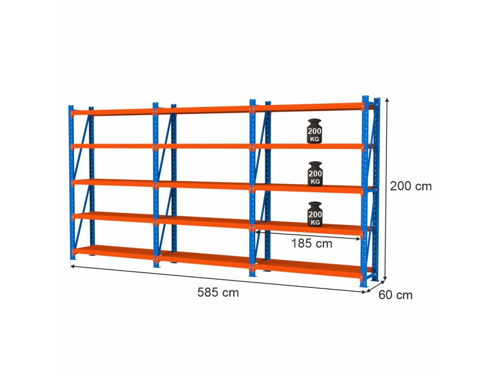 Skladový regál FORTIS, 15policový, výška 200 cm, délka 585 cm, hloubka 60 cm