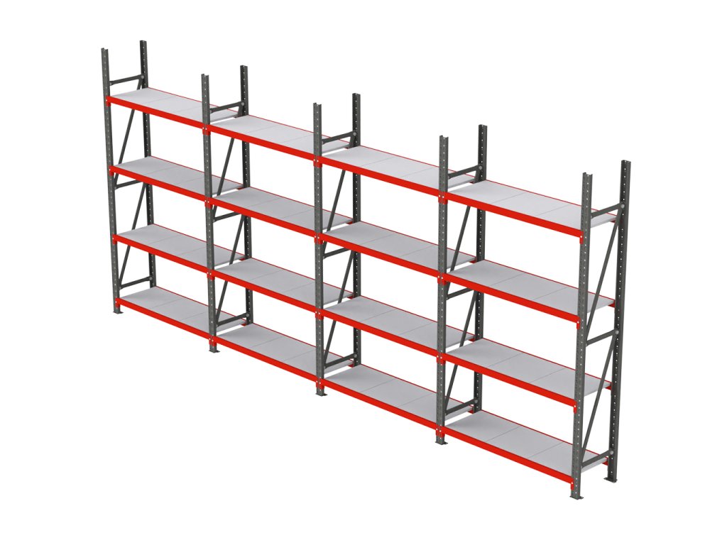 Skladový regál FORTIS, 16policový, výška 200 cm, délka 642,5 cm, hloubka 40 cm