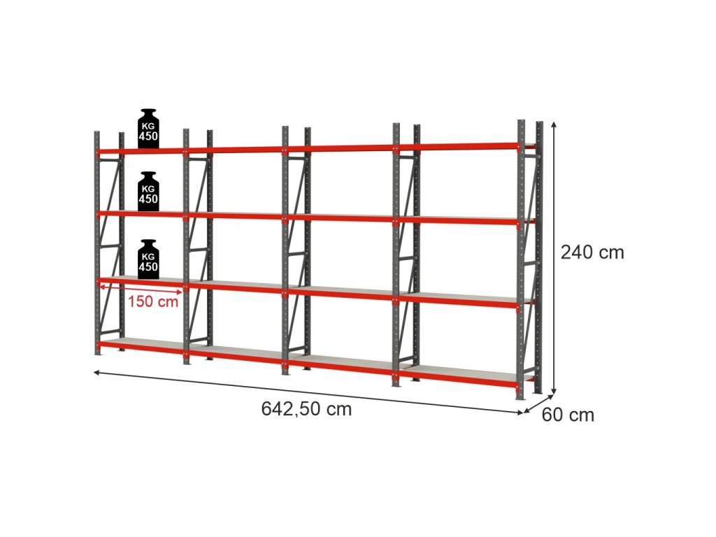 Díky 16 policím o rozměrech 150×60 cm a nosnosti až 450 kg na každou polici (při rovnoměrném zatížení) tento model ideálně kombinuje vysokou kapacitu s úsporou místa.