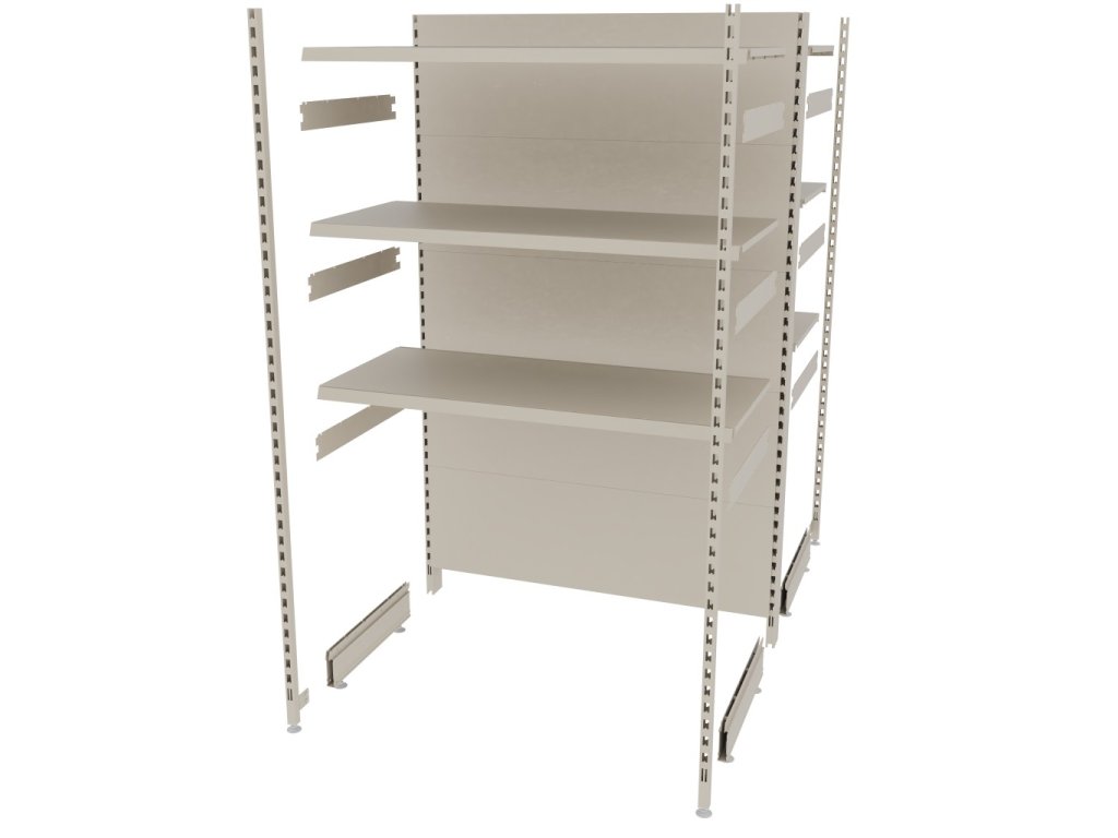 Oboustranný zesílený obchodní regál – gondola pro paletu MAGO, základní modul, krémový – výška 210 cm, délka 128 cm